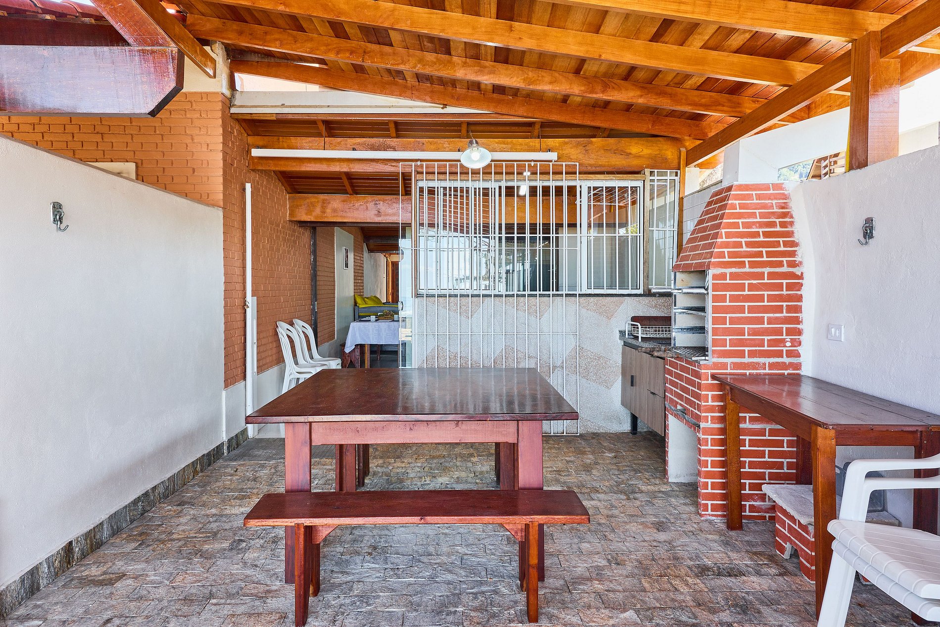 Área gourmet com churrasqueira, mesas e cadeiras