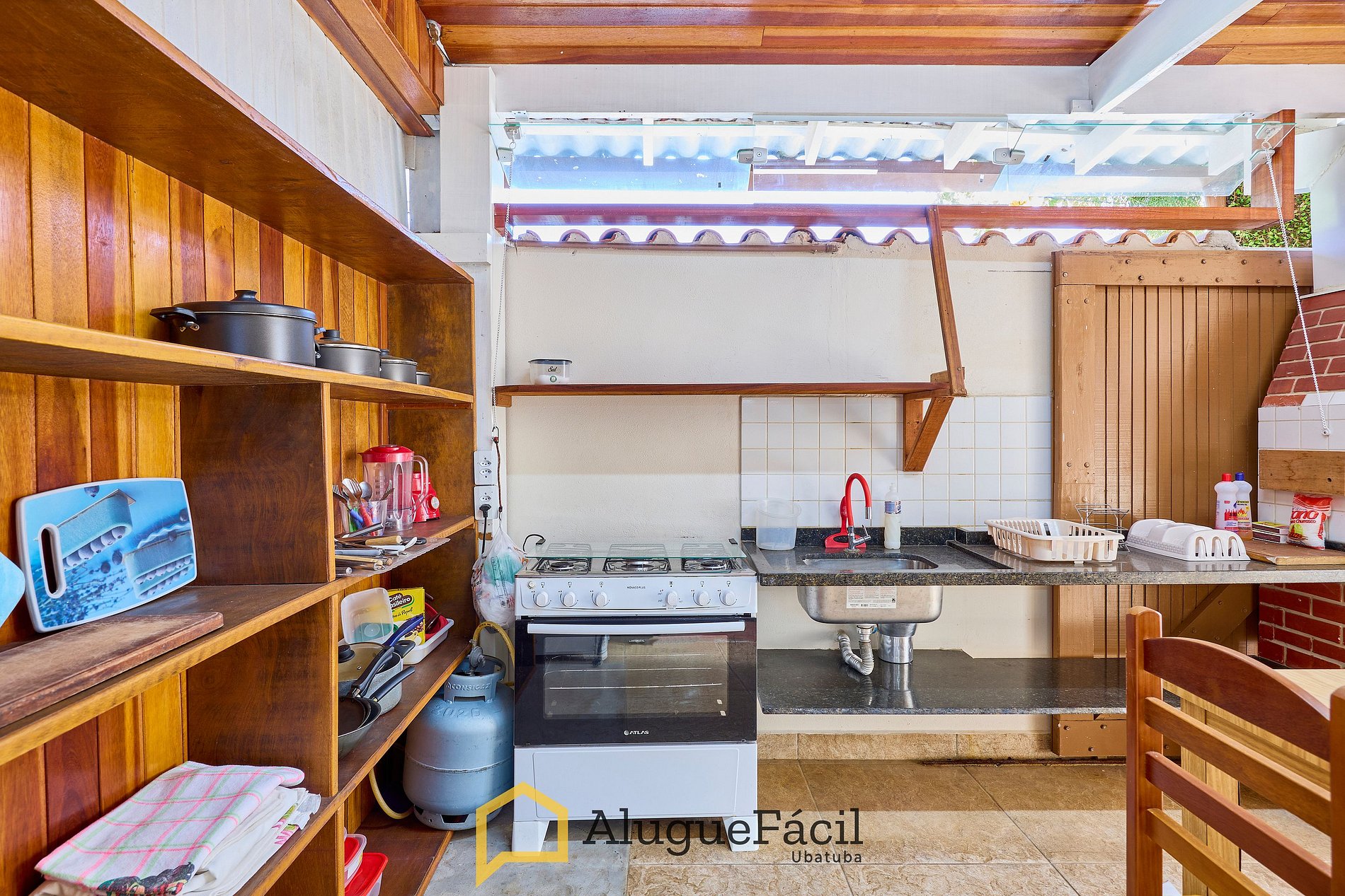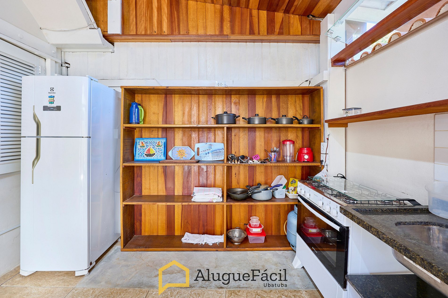 Cozinha super completa (com microondas, fogão com forno, cafeteira elétrica, Air fryer) integrada com